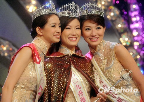 全港瞩目的选美盛事二00九香港小姐竞选决赛二十二日晚圆满结束。芳龄二十三岁的刘倩婷(中)胜出,荣登港姐冠军宝座。亚军是李姿敏(右),熊颖诗夺得季军(左)。中新社发 邓庆乐 摄