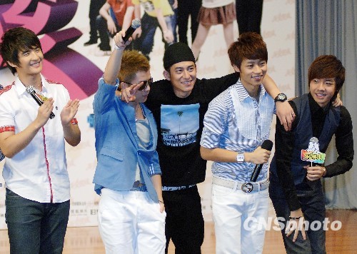 8月23日,湖南卫视旗下天娱打造的电影《乐火男孩》在北京举行首映,香港导演林华全携俞灏明、唐笑、魏晨、王栎鑫等多位快男超女共同出席。《乐火男孩》是国内首次尝试以3D真人实景的拍摄方式,结合歌舞元素的青春励志电影。该片首次一口气云集了13位快男和超女唐笑,再加上成龙唯一女“弟子”徐冬梅出演。图为该片众位快男主演。中新社发 李学仕 摄