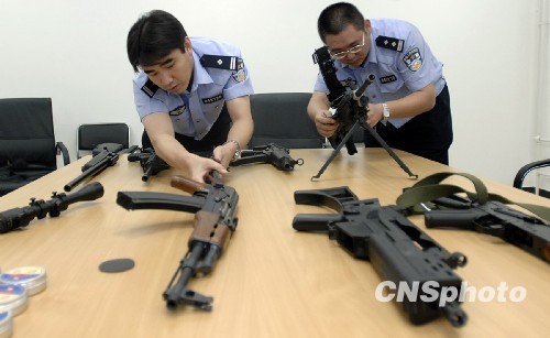 近日,酷爱枪支的发烧友周某,被北京丰台警方因涉嫌非法持有、私藏枪支、弹药罪刑事拘留。同时查获15支仿真枪,5000余颗4.5毫米钢珠子弹和740发铅弹。据嫌疑人周某供述,自己非常喜欢收藏枪械,这些仿真枪都是从互联网上以每支一千元左右的价格购买,然后,放在家中进行收藏的。在查获的15支仿真枪中,大部分都是通过压缩气体射出俗称PP弹的塑料子弹,对人身进行射击的话,都会造成不同程度的伤害。其中,有2支装有气瓶装置,击发铅弹的枪支经过相关部门鉴定,对人身具有杀伤力。中新社发 杨阳 摄