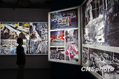 图为一名参观者在《平息乌鲁木齐“7·5”打砸抢烧严重暴力犯罪事件纪实图片展》的图片前沉思。中新社发 盛佳鹏 摄