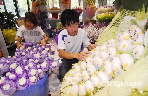 8月25日,浙江省温岭花店别出心裁地推出了用喜羊羊毛绒玩具包装的花束,希望能在情人节火上一把。中新社发 吴鹏飞 摄