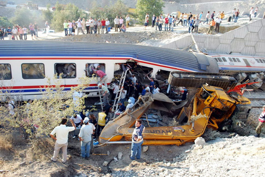 8月27日,土耳其西北部比莱季克省发生一列火车与一辆工程车相撞事故,造成4人死亡,19人受伤。图为事故现场。
