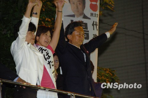 图为鸠山由纪夫和民主党众议院议员候选人江端贵子在选举车上呼吁选民支持。中新社发 段跃中 摄