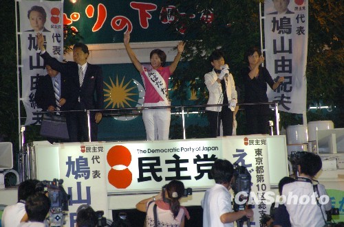 图为鸠山由纪夫和民主党众议院议员候选人江端贵子在选举车上呼吁选民支持。中新社发 段跃中 摄