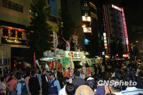 图为鸠山由纪夫和民主党众议院议员候选人江端贵子在选举车上呼吁选民支持。中新社发 段跃中 摄