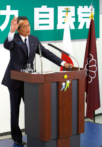 图为麻生太郎出席在东京自民党总部举行记者会。