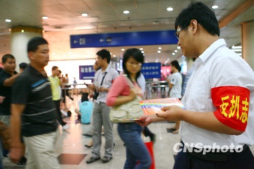 8月31日,一名反扒志愿者在北京西站向旅客分发反扒信息传单。中新社发 苏丹 摄