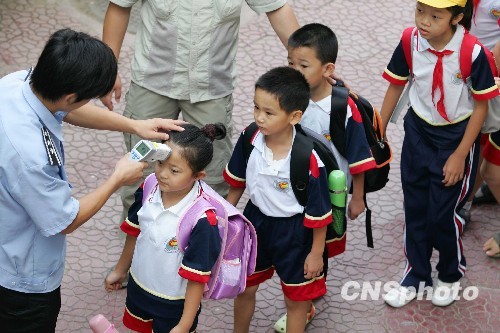 9月1日,中小学迎来新的学期,北京市海淀区二里沟中心小学学生在入校前接受体温检查。为防范甲型H1N1流感疫情的传播,确保师生身体健康,从9月1日开始,师生进校前均需测量体温,只有体温合格,才能入校。中新社发 富田 摄