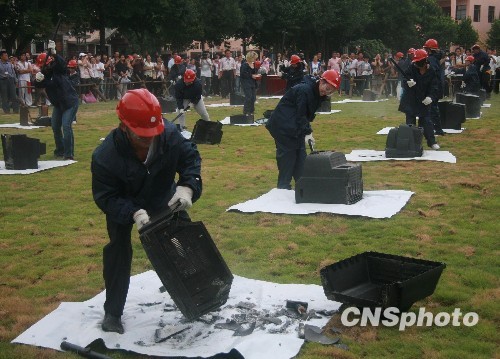9月1日,一群全副武装、手持铁锤的都市人在长沙世界之窗滑草坪上疯狂砸电视,以此宣泄心中的压力。据悉,为帮助都市人群释放因工作、生活带来的压力和郁闷,长沙世界之窗从当日开始举行为期一个月的减压节。主办方将收集来的摩托车、小车、电视机、洗衣机等废旧设备摆放在预设的场地内,每天召集数十名游客参与其中。中新社发 肖前辉 摄