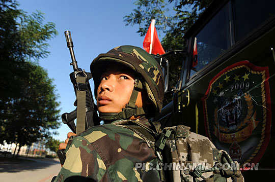 9月1日上午,参加“跨越-2009”演习的沈阳军区某师先遣分队官兵,实兵实装实施空运,拉开千里大机动演习帷幕。