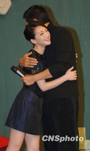 图为周润发与周迅倾情拥抱。中新社发 李学仕 摄