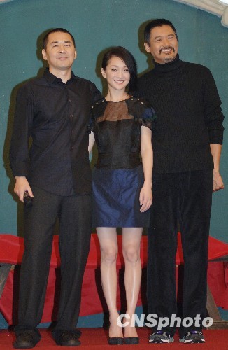 图为主演周润发、周迅、陈建斌在发布会现场。