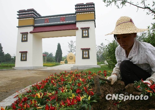 9月2日,一名工作人员正在花博会室外展区中的西藏展区前施工,第七届中国花卉博览会将于9月26日至10月5日在北京顺义举行。中新社发 富田 摄