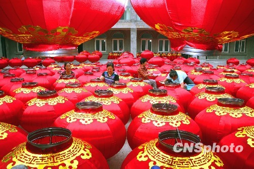 9月2日,北京市怀柔区九渡河镇红庙村35名村民加紧为城区赶制10000多盏大红灯笼,在国庆前夕交给订户并悬挂在北京和怀柔城区街头以及公园,为伟大祖国60周岁献礼。