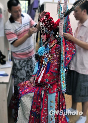 图为9月4日,造型师正在给来自荷兰的学员佩冠,装扮剧中人物穆桂英。 中新社发 张丽君 摄