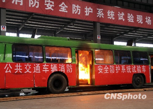 四川省消防总队研发的首款防火型公交车9月3日亮相,并通过成果鉴定。10月份,首批防火型公交车将驶上成都街头。 据四川省消防总队防火部部长宋晓勇说,该系统利用车辆自有动力,用专用雾化喷头释放对人体无毒副作用、无刺激性绿色环保灭火剂控火灭火、降温并稀释有毒烟雾。系统的响应时间不大于5秒,能在10秒内控制、在60秒内扑灭各类型公共交通车辆客舱和发动机舱内的固体和液体火灾,保护油箱(气瓶),防止爆炸,为乘客赢得疏散时间。按目前该系统研发安装成本来看,一辆公交车需投入2万至3万元。 中新社发 姚云辉 摄
