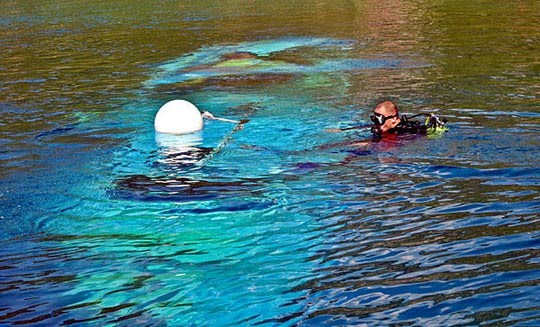 一辆超载的观光船5日在马其顿奥赫里德湖离岸200多米处突然尾部断裂,很快沉没,目前已导致15人死亡。初步分析认为,超载是造成悲剧的主要原因。图为警方的潜水员在搜寻溺亡游客遗体。