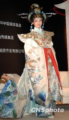 9月6日,张艺谋鸟巢版《图兰朵》携手时尚风云汇活动,在北京盘古七星酒店举行。张艺谋、宋祖英、成龙、范冰冰、王学圻、戴玉强等众大腕携手出席为演出一个月倒数计时。“2009中华小姐环球大赛”中诞生的《图兰朵》全球品牌形象代言人李若凝正式履新,携手张艺谋及其主创团队为《图兰朵》酿声造势。图为李若凝身穿华服造型登场,因为头饰太重,她笑称做公主”头“很累。中新社发 李学仕 摄