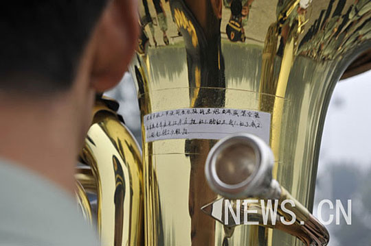 演奏也有“小诀窍”:为防止背错43首曲目顺序,队员将曲目简称贴在大号上。罗甲振 摄