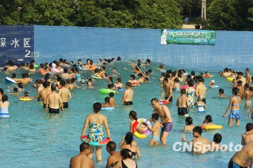 2009年9月8日,南充市某处游泳池。当日,四川省南充市最高气温逼近40℃,当地气象台发布高温橙色预警信号,至此已两天发出高温橙色预警。南充遭遇持续高温天气,人们纷纷走进游泳池避暑降温,部分中小学校从9月8日起放假3天,避开暑热高峰后复学。