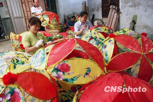 2009年9月9日,在山东潍坊市区一家工艺美术制作厂内,工人们正在扎制民间传统造型装饰物。随着国庆节的临近,该家工艺美术制作厂马不停蹄地赶制绣球、风筝、扇面等造型工艺装饰物送往北京,送去鸢都潍坊人民祝愿祖国六十华诞的心意。