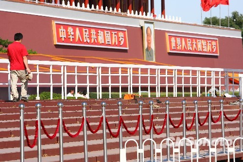 为迎接国庆六十周年庆典,天安门城楼两侧观礼台前,搭建起了数百平方米的临时观礼台。红色基座,白色栏杆,基本与原观礼台保持了同样的风貌。