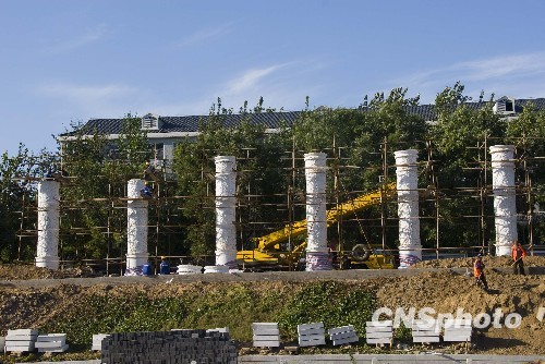 9月12日,北京南护城河北岸“二十四节气柱景观”施工现场。据现场工人介绍,“二十四节气柱景观”沿南护城河北岸永定门东街段用四组大理石雕塑分别表示春夏秋冬,每个景观柱上都刻有二十四节气。整个工程将在国庆节前完工。
