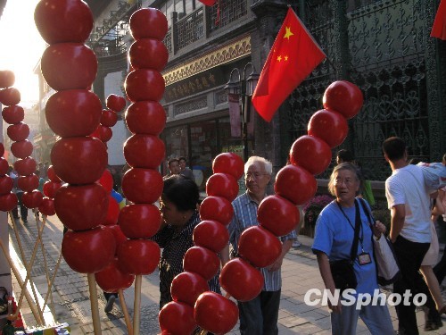 9月14日,北京大栅栏商业街道为建国六十周年大庆和中秋佳节进行街景布置,营造节日喜庆的气氛。中新社发 邹宪 摄