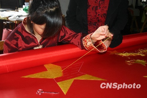 为庆祝新中国六十岁生日,著名蜀绣大师、蜀绣传承人孟德芝(右)率领9名弟子,从9月2日起,在位于成都文殊坊的“禅林蜀绣苑”绣艺室开始绣五星红旗为新中国六十岁生日献礼。这面非同寻常的五星红旗目前已完成了三分之二,用的上等的红绸和蚕丝线,并采用蜀绣特有的运针手法进行,长144厘米,宽96厘米,将于10月1日国庆在金沙博物馆举行的庆祝活动中现场收针并展出。中新社发 霍潺 摄