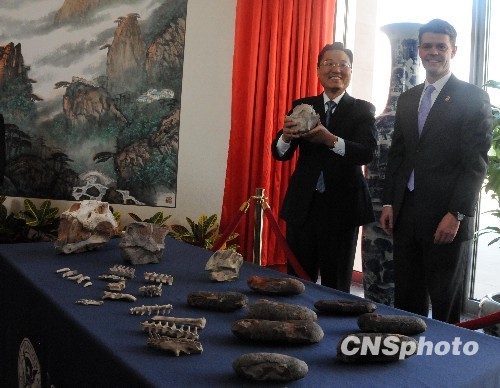9月14日,美国国土安全部下属的两大执法部门——美国移民和海关执法局(ICE)、美国海关和边境保护局(CBP)在华盛顿联合将一批具有一亿年历史的剑齿虎化石和鹦鹉嘴龙化石,以及一批恐龙蛋化石移交给中国驻美大使馆。