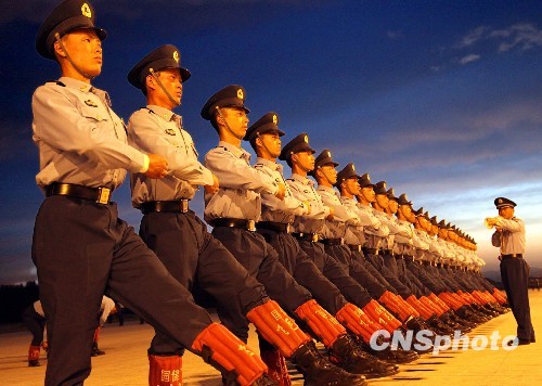 9月中旬,建国六十周年国庆阅兵进入冲刺阶段,位于北京郊区阅兵村中的空降兵方队官兵们正披着彩霞紧张训练。中新社发 卢炳广 摄