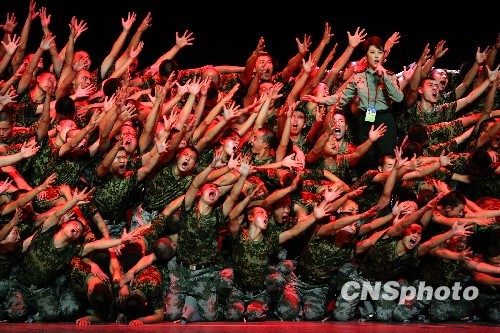 9月17日,大型音乐舞蹈史诗《复兴之路》新闻发布会在北京人民大会堂举行。这是一台为庆祝中华人民共和国成立60周年而创编的音乐舞蹈,是以中华民族自鸦片战争以来169年中的探索、奋斗、发展史为线索全景式史诗性艺术作品,是继《东方红》、《中国革命之歌》之后,中国文化艺术史上的又一部大型音乐舞蹈史诗,9月20日将在人民大会堂隆重首演,演出持续至10月5日。图为演员在进行最后的紧张彩排。中新社发 富田 摄