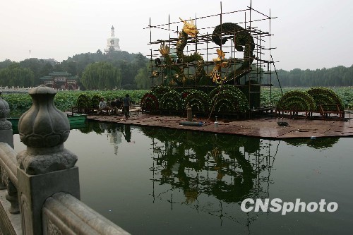 9月17日,北海公园南门太液池中的国庆主题花坛已现雏形。与其它公园的花坛不同,这处花坛是建于水面之上,既能与白塔、荷花相映成趣,又不影响游客在园中通行。花坛将以植物材料制成的龙凤造型作为主景,建成后,祥龙与彩凤在太液池上飞舞组成数字“60”,在60个喷泉的映衬下,颇有气势。中新社发 富田 摄