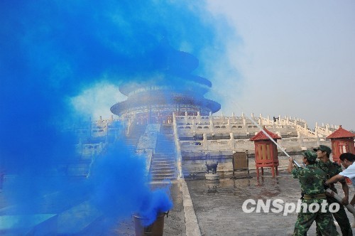 9月17日,国庆游园安保综合演练在北京天坛公园举行。历时50分钟的可疑物排查、“大人流”疏控、灭火救援等突发事件处置演练,展示了一次多警种作战、多部门参与的综合性演练。中新社发 李连杰 摄