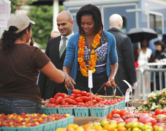 当地时间9月17日,美国第一夫人米歇尔·奥巴马提着菜篮子在白宫附近的菜市场买菜。当天是这个菜市场首次开张营业。