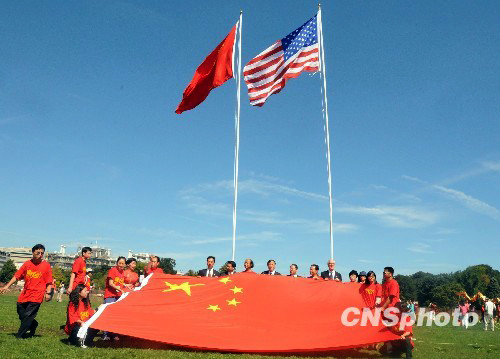 9月20日,上千名旅居美国的华人华侨在美国首都华盛顿美国总统府南面外侧的公共草坪上举行盛大的庆祝活动,同时举行隆重的升中美两国国旗仪式,这也是中国国旗一次由民间组织在白宫前方的公共草坪上升起。