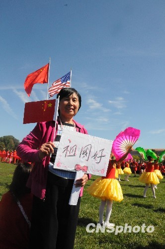 图为一名华侨举着“祖国好”的标语出席升旗仪式。中新社发 吴庆才 摄