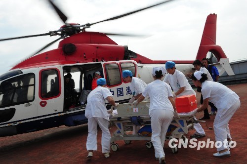 9月21日,南宁市政府、广西海事局和广西政府应急管理办公室联合举办“2009年南宁水上突发事件应急反应演习”,在邕江南宁市民生广场段举行。参加此次演习的有22艘船舶,1架直升机,1辆120医疗急救车,参演人员300多人,相关部门应急联动,开展水、陆、空立体救援演习。图为直升飞机救起落水伤员送抵广西人民医院综合大楼楼顶停机坪,医务人员快速接应展开救治。中新社发 雷祖益 摄