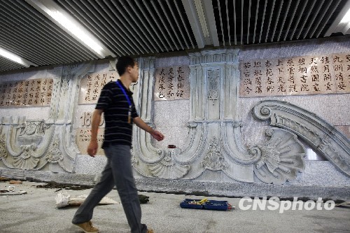9月21日,记者“探秘”北京地铁4号线,圆明园站站厅内,乘客上下车必经之路的墙面上,浮雕出的灰色大水法遗迹夺人眼球,在深褐色底色的映衬下,显得肃穆、庄严。浮雕背后还印上了建园、毁园、烧园三个历史时期的年号,静静诉说着圆明园这个“万园之园”的兴衰史。地铁4号线有望25日正式开通。中新社发 郑雄增 摄