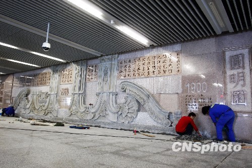 9月21日,记者“探秘”北京地铁4号线,圆明园站站厅内,乘客上下车必经之路的墙面上,浮雕出的灰色大水法遗迹夺人眼球,在深褐色底色的映衬下,显得肃穆、庄严。浮雕背后还印上了建园、毁园、烧园三个历史时期的年号,静静诉说着圆明园这个“万园之园”的兴衰史。地铁4号线有望25日正式开通。中新社发 郑雄增 摄
