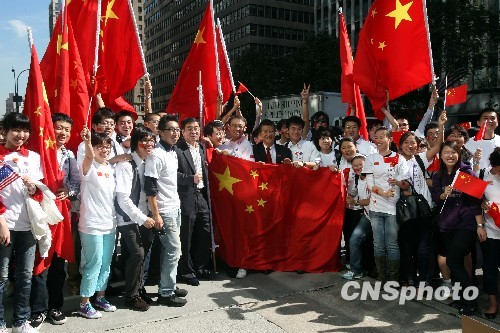 9月21日,纽约大学中国学生会组织学生欢迎胡锦涛主席访问美国。中新社发 孙宇挺 摄