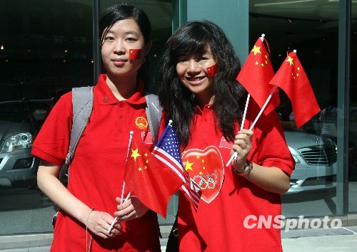 图为来自康奈尔大学的两名中国女学生在纽约街头欢迎胡主席的到访。中新社发 孙宇挺 摄
