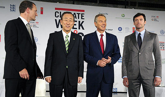 图为(自左至右)英国气候集团首席执行官史蒂夫·霍华德、联合国秘书长潘基文、英国前首相托尼·布莱尔和演员休·杰克曼出席纽约气候周开幕式。