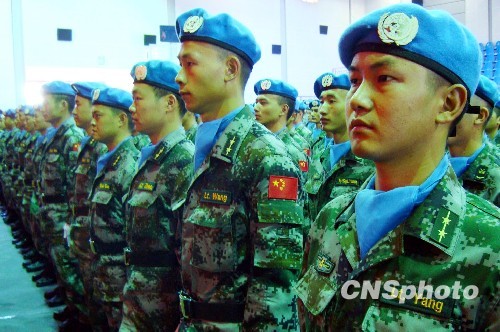 应联合国请求,经中央军委批准,中国第六批赴黎巴嫩维和工兵营22日在成都军区驻滇某集团军工兵团正式成立,275名头戴蓝色贝雷帽、身着07式迷彩服的工兵营维和官兵在此间接受了军区领导的首次检阅,工兵营先遣队将于十月中旬向黎巴嫩开进,第二梯队将于十月下旬出发。图为22日受阅仪式上的维和工兵营官兵。中新社发 杨洋 摄