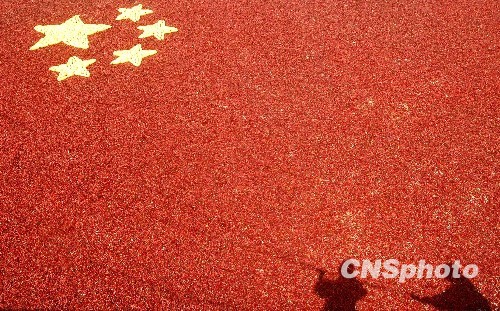 9月22日,山东省郯城县红花乡大新庄村农民用500余公斤红辣椒和600多个玉米棒,组成了长15米、宽10米的国旗图案,以此迎接国庆60周年,祝福祖国繁荣昌盛。 中新社发 房德华 摄