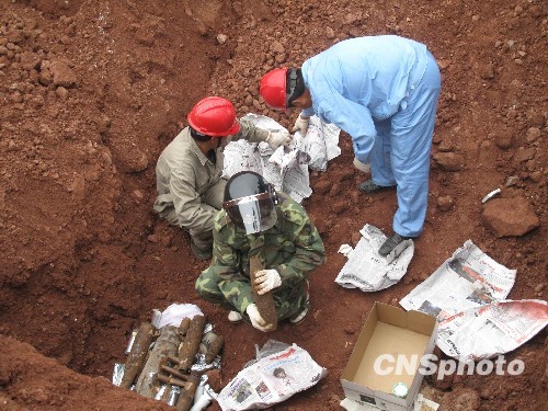 安徽警方销毁509枚废旧炮弹及非法枪支。中新社发 艾裴 摄