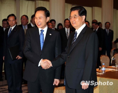 中国国家主席胡锦涛二十三日上午在纽约会见韩国总统李明博。双方就双边关系和共同关心的其他问题交换意见。李明博说,在全球经济不景气的情况下,中国经济企稳回升,这不仅对中韩两国经贸关系,而且对全球经济回升起到非常重要的作用。中新社发 张朔 摄