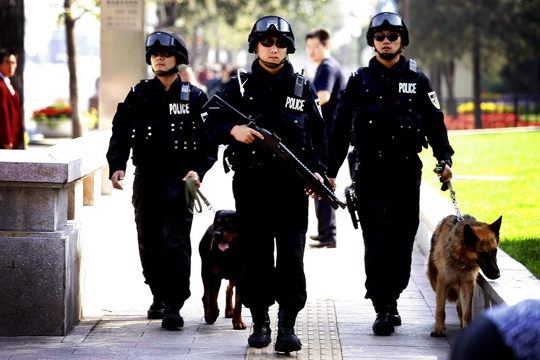 2009年9月23日,“蓝剑突击队”在北京市街头持枪携警犬在长安街上执勤,以保国庆60周年安全。