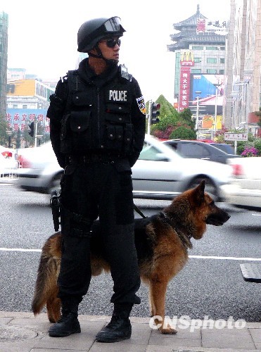 “蓝剑突击队”在北京市街头持枪携警犬在长安街上执勤,确保国庆60周年安全。中新社发 玉龙 摄