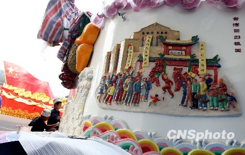 9月24日,两名工作人员正在对“宝岛台湾彩车”仔细地粉刷。该彩车将参加首都国庆60周年群众游行。中新社发 张宇 摄